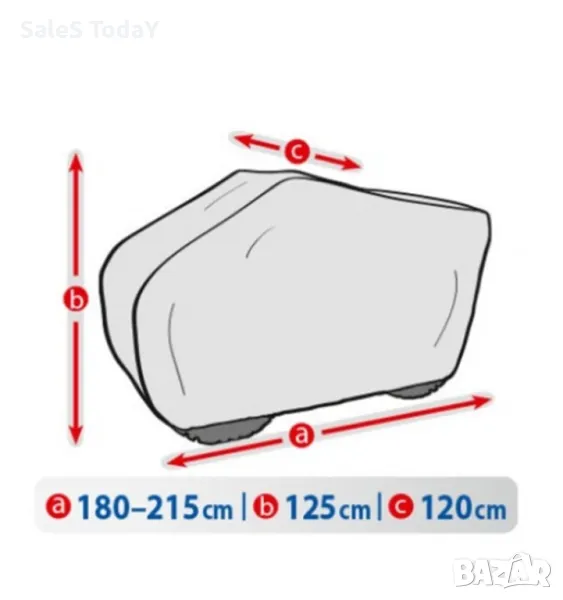 Цвят: СивоДължина: 180- 215смВисочина: 125смШирина: 120смТегло (кг): 2.000Производител: Kegel-BlazusiakВсесезонен продукт.Предпазва от: Сняг, замръзване, дъжд, вятър, листа, дървесен сок, UV лъчи, птици, цветен прах и още много др.Вътрешната мембрана е мека и няма да надраска боята на превозното стведство.Покрива цялото превозно средство.Лесен за съхранение и транспортиране - не заема много място.Множество механизми за закрепване към мотора - ластична лента, връзки.