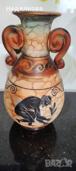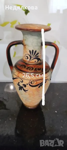 Ръчно рисувана керамична амфора, която ще предаде изисканост във вашия дом. Препоръчително е да не се налива вода в нея,а да се използва само за декорация. Цената е за една бройка.