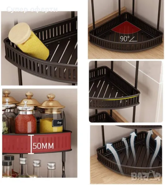 Ъглова стойка за подправки 2 нива – Органайзер за кухня, баня и спалня, без монтаж → Обява 49868559