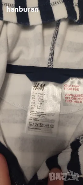Детски халат с цип и качулка H&M, размер 98-104. Няма забележки. Много е удобен. Подходящ за вкъщи, плаж, басейн, хотел и т.н. Тъмносини райета.