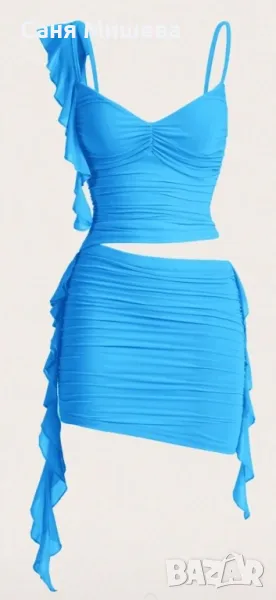 Дамски комплект от две части в син цвят. Идеален за различни поводи и лесен за комбиниране с други дрехи.