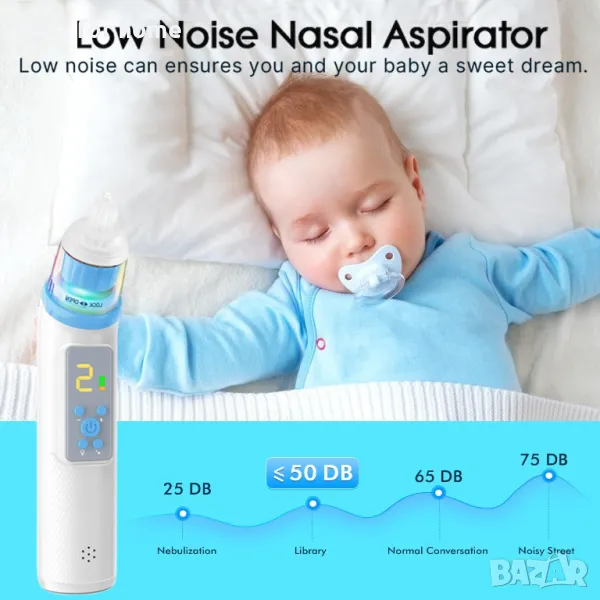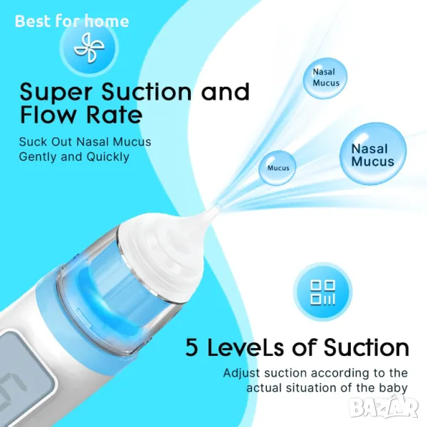 5 режима на регулируемо засмукване. Детската смукалка за нос осигурява 5 режима на засмукване максимум до 75KPa, които могат да се регулират според действителната ситуация на бебето, изсмуквайки назалната слуз нежно и бързо. Използването на връхчета от тиква за новородени е безопасно и ефективно. При упорити назални буки и слуз, първо ги омекотете с физиологичен разтвор за нос и след това изчакайте около 30 секунди, за да ги изсмучете. Продукти за грижа за бебето
