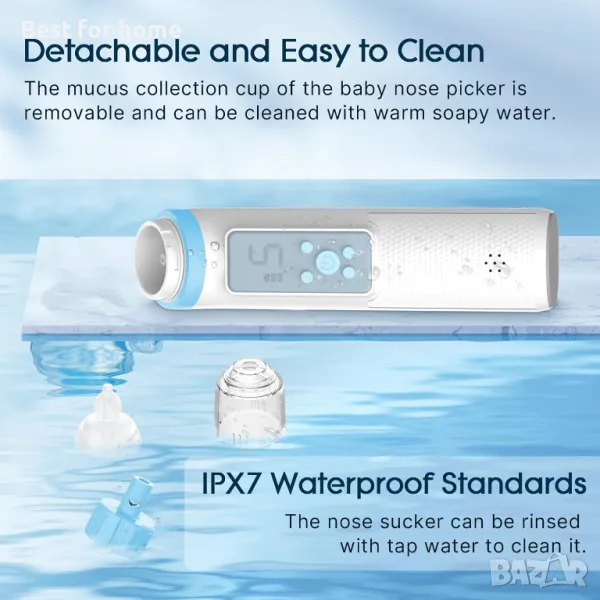 Водоустойчив препарат за почистване на нос за бебе. Чашата за събиране на слуз на електрическата бебешка дръжка за нос е подвижна и може да се почиства с топла сапунена вода. Събирателната чашка е с антирефлуксна структура, която предотвратява обратното изтичане на вдишаната назална слуз. Този електрически назален аспиратор за бебе е строго тестван, за да отговаря на стандартите за водоустойчивост IPX7 и може да се изплаква с чешмяна вода, за да се почисти. Бебешки неща за търсене в регистър на бебета