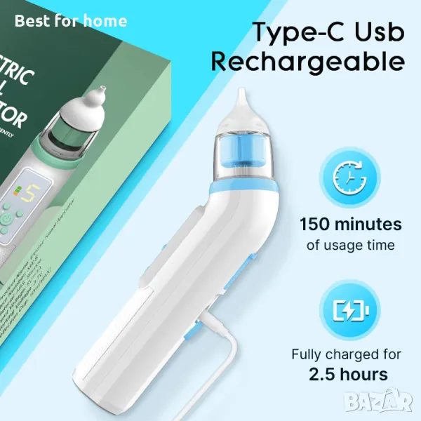 Дълъг живот на батерията и възможност за зареждане през USB. Акумулаторната бебешка смукалка за нос може да се използва 150 минути след пълно зареждане. Пълното зареждане отнема около 2,5 часа. Тази лека смукалка за нос за малки деца се предлага с кутия за съхранение, която ви позволява да опаковате аспиратора за нос и накрайниците по всяко време или да ги вземете навсякъде. Моля, изсушете смукалото за нос за бебе преди сглобяване и съхранениел