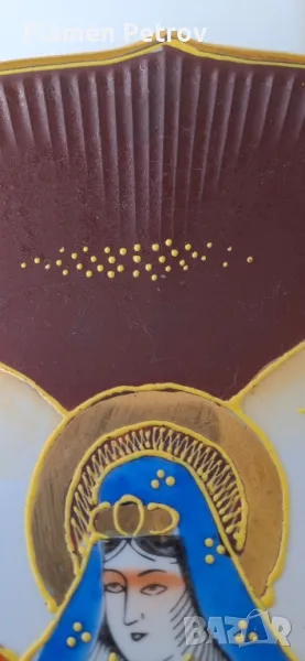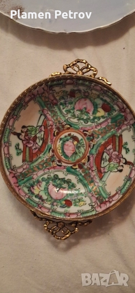 Стара китайска чиния с позлатен бронзов обков и ръчно рисувани мотиви с размери от диаметър 14см