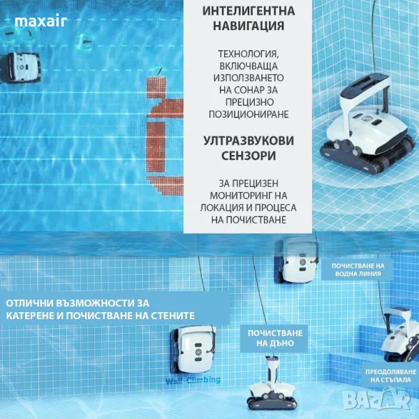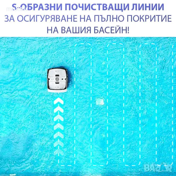 Роботът за басейни има мощен 150W мотор, задвижване на 4 колела, осигурява покритие на 180 кв.м площ чрез интелигентна навигация с планиране на маршрута като по този начин може ефективно да събира пясък, мръсотия, листа и други замърсявания от басейни, изработени от различни материали – плочки, мозайка, PVC и други.