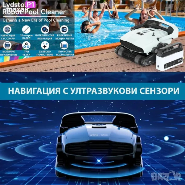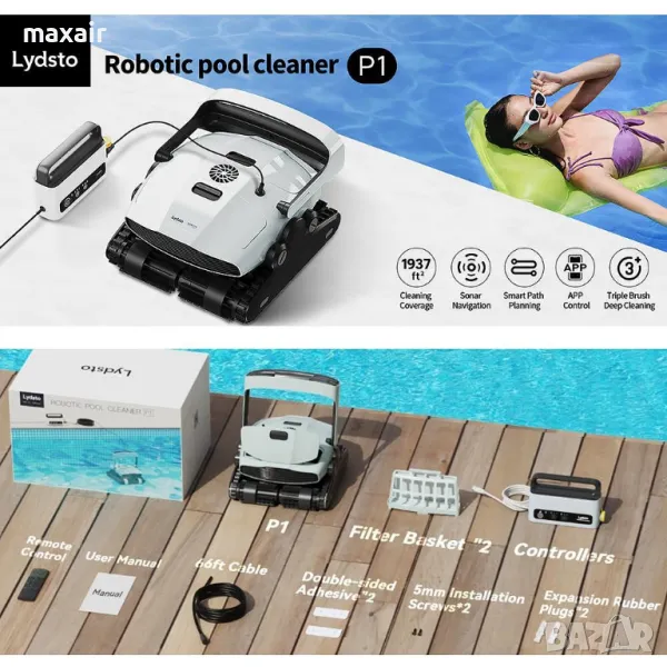 Робот за басейни Xiaomi Lydsto P1 е премиум клас робот за почистване на басейни, който притежава голям набор от високотехнологични характеристики – вграден сонар и ултразвукови сензори за прецизна навигация, 3 въртящи четки за дълбоко цялостно почистване на дъно, стени и водна линия, 2 контейнера с общ капацитет от 3 литра, обгърнати от фини 250-микронови филтри, както и функционално мобилно приложение за пълен контрол над почистващия процес!
