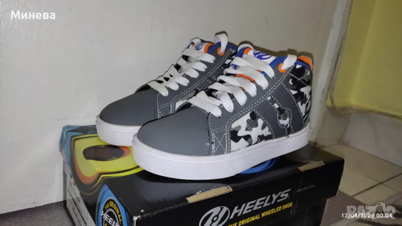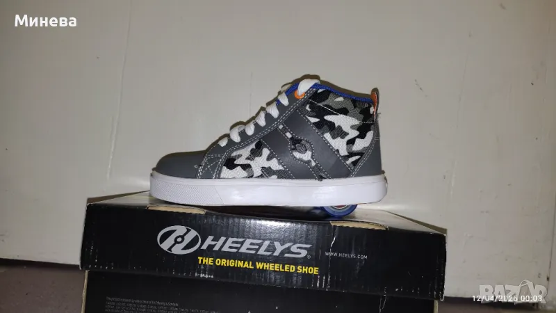Маратонки с колелца HEELYS в сив маскировъчен нюанс, изработени от висококачествена кожа и текстил за отличен комфорт при носене, с по едно голямо колелце на обувка за повече стабилност при каране, в комплект с ключе за лесно сваляне на колелцата и капачета за затваряне на отворите когато са без колелца и възможност за носене като обикновени маратонки. Номер 31 и дължина на стелката 18 см. Чудесен подарък за всяко дете обичащо забавленията.