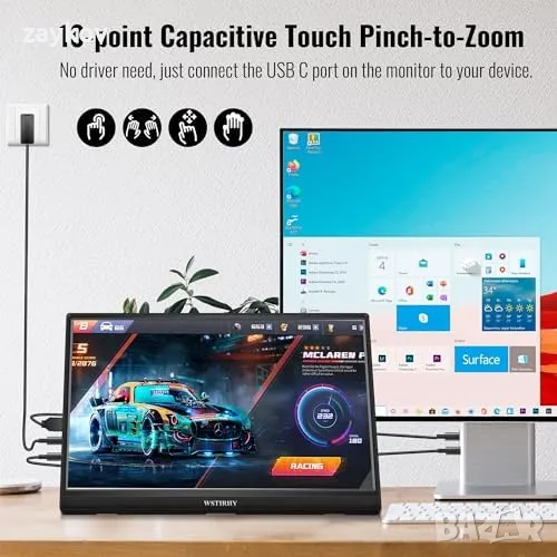 10-точков капацитивен сензорен монитор]: Съвместим с всички Mac и PC системи. Просто свържете USB кабела към вашето устройство, за да получите функцията за докосване. ЗАБЕЛЕЖКА: За да постигнете функцията за докосване, USB-C към A или USB-C към C кабел трябва да бъде свързан директно към USB-C порта на монитора и вашето устройство. Функцията за докосване не поддържа щракване с десен бутон на мишката и продължително натискане за активиране на функцията за опция.