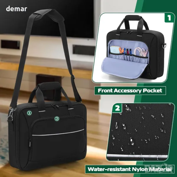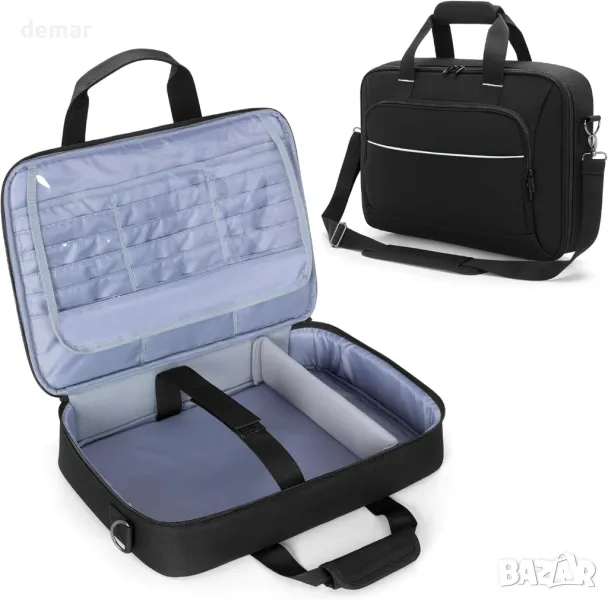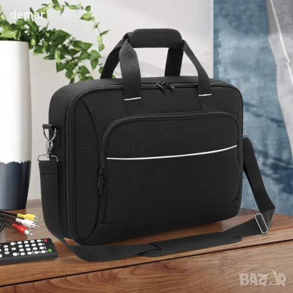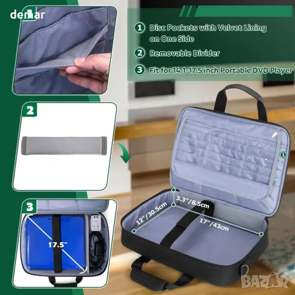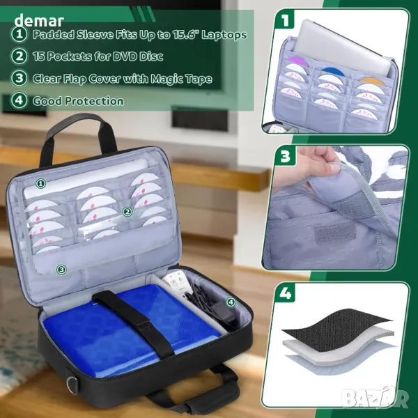 Изработена от водоустойчив найлон с 5 мм пяна, тази чанта предлага солидна защита за вашия преносим DVD плейър по време на пътуване. Подходяща е за повечето модели от 14,1” до 17,5” и включва разделител и закрепващи каишки за плътно прилягане. Основното отделение разполага и с подплатен джоб за лаптопи до 15,6”. Външен преден джоб разполага с слотове и калъфи за зарядни устройства, дистанционни управления и аксесоари, а 15 джоба с кадифена подплата за DVD дискове поддържат колекцията ви организирана и без надраскване. Прозрачен капак предотвратява изплъзване на предметите. Носенето е лесно с подплатени дръжки, презрамка и каишка за багаж за колички.