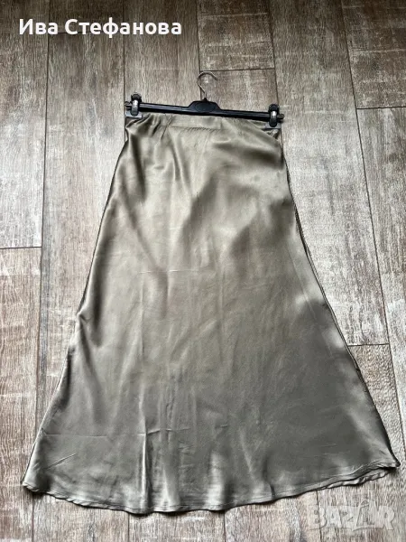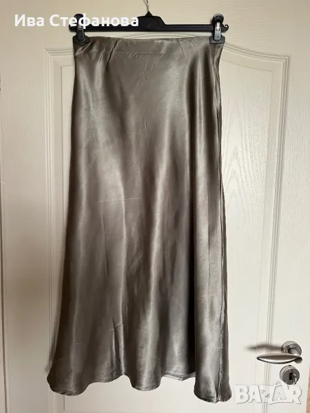 Нова дълга маслено зелена течно злато елегантна пола тип русалка сатен сатенена. Размер 2 Хл ще стане и за Хл . Дължина 92 см , талия 80 см разпъва се поне до 100 см . Размер XL ще стане и за Л . Разгледайте и другите ми обяви .
