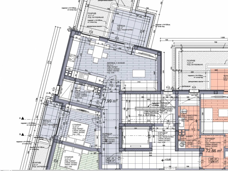 Имотът с обща площ от 87.28 кв.м е разположен на 6-и мансарден етаж.