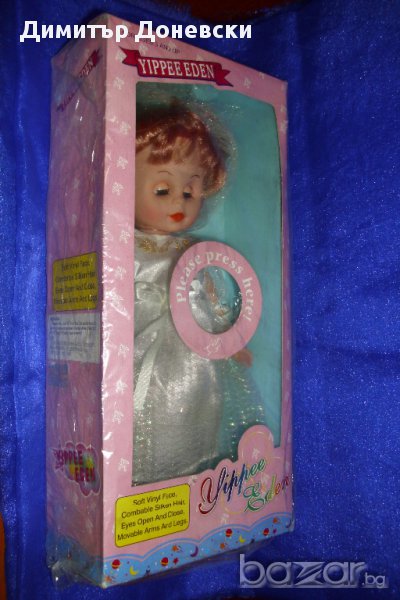 Продавам пееща музикална кукла с батерии. С лице от винил, може да си отваря и затваря очите, да си движи ръцете и краката. Размери (с кутията): 15 х 33 см. За деца над 3 години.
