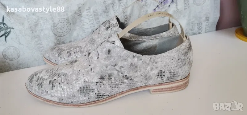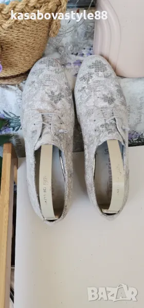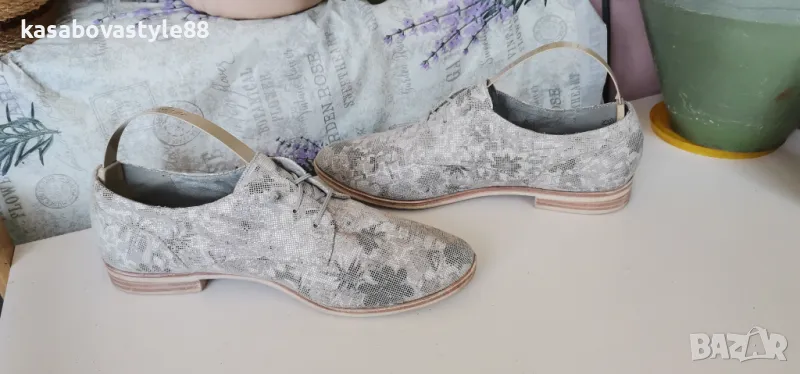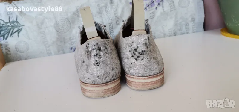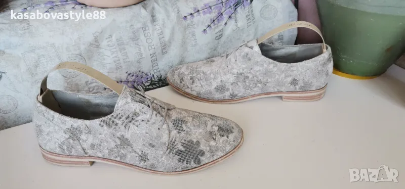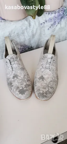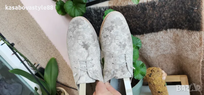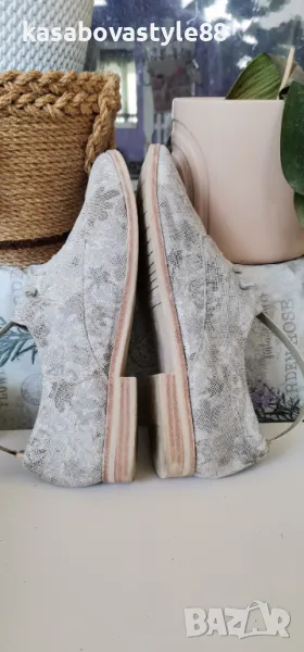 Ежедневни дамски обувки от немската марка Tamaris Изработени от естествена кожа с флорални мотиви в сив цвят. Разполагат с еластични връзки, благодарение на което се обуват много лесно. Отвътре са с текстил. Отговарят на 37 н. В предната си част са доста стеснени. Дължина на стелка 24.4смТок-2см Цялостна височина отзад 8см.