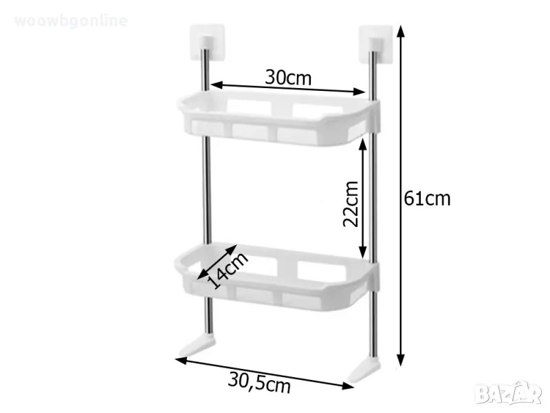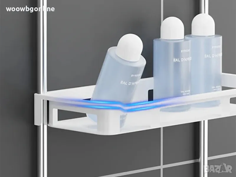 Функционалният му дизайн го прави идеален за съхранение на козметика, аксесоари за баня и кърпи. Благодарение на здравата си конструкция, рафтът осигурява стабилност и дълготрайна употреба.