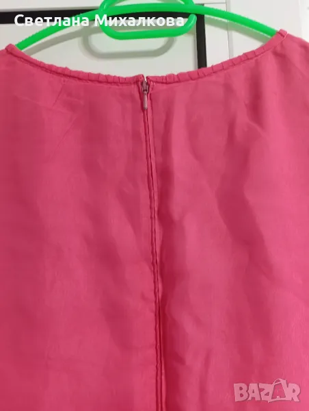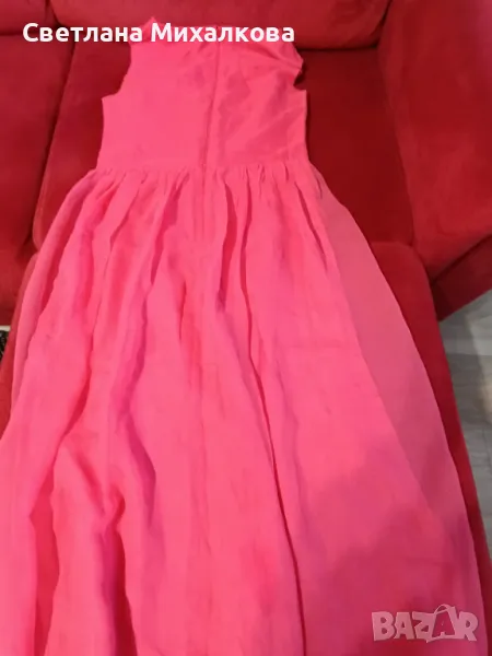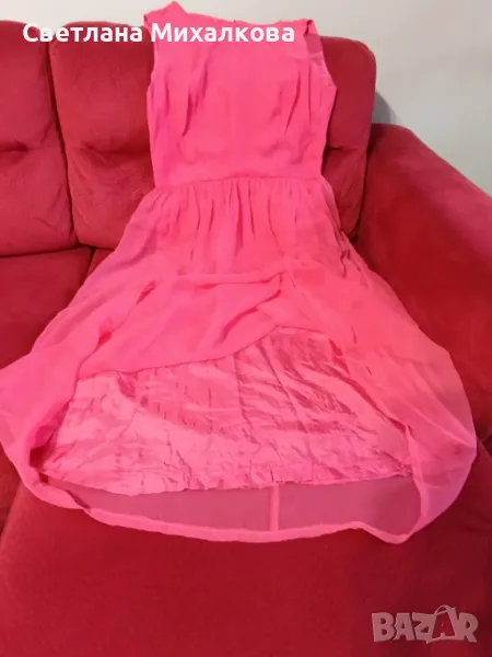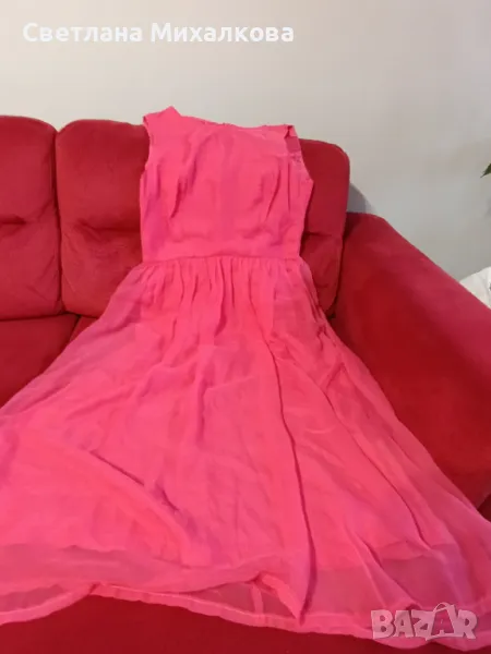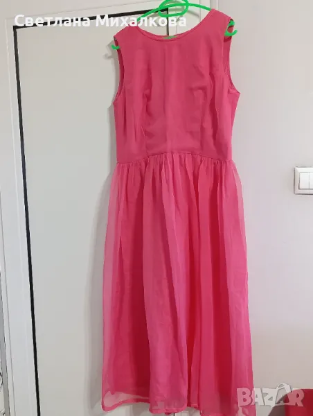 Продавам дамска лятна рокля от изкуствена коприна,розова на цвят,с хастар, закопчаване на гърба с цип с размерите раменете 40 см, гръдната обиколка едностранно 46 см,талията 40 см, дължина на роклята 122 см