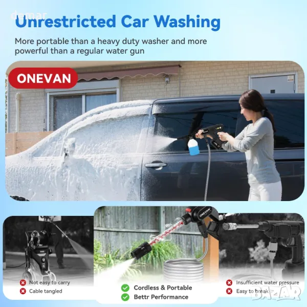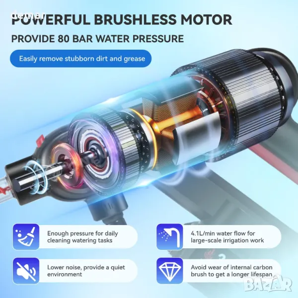 Този безжичен пистолет - водоструйка е снабден с мощен 300W безчетков мотор с три регулируеми настройки на налягането (8, 12 и 16 бара), за да се справи с всичко - от леко изплакване до интензивно почистване. Той предлага максимален обхват от 10 метра с 5-метров маркуч и осигурява постоянен дебит от 4,1 л/мин за ефикасни резултати. Лекият, ергономичен дизайн осигурява комфортна употреба, дори при по-дълги задачи, а батерията с капацитет 4,0 Ah добавя удобство без кабел. Включените аксесоари, като дюза за високо налягане, филтър за отпадъци и микрофибърна кърпа, го правят подходящ за поддръжка на градината, миене на автомобили и общо почистване на домакинството.