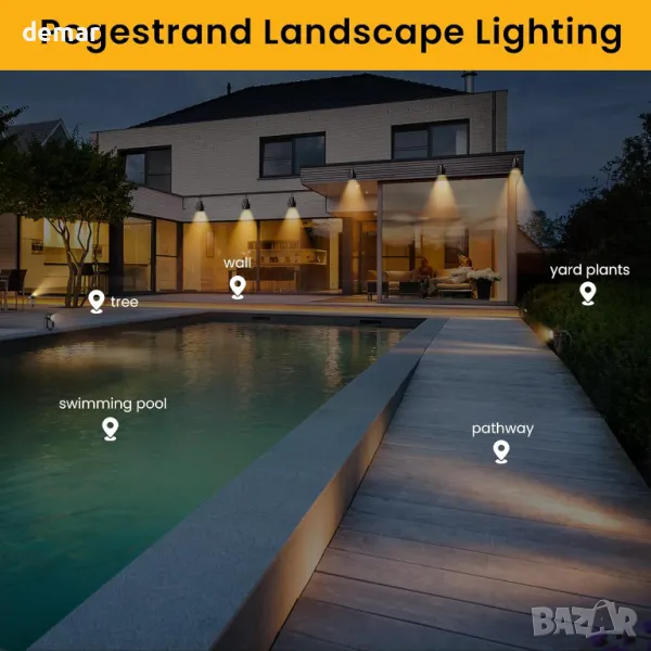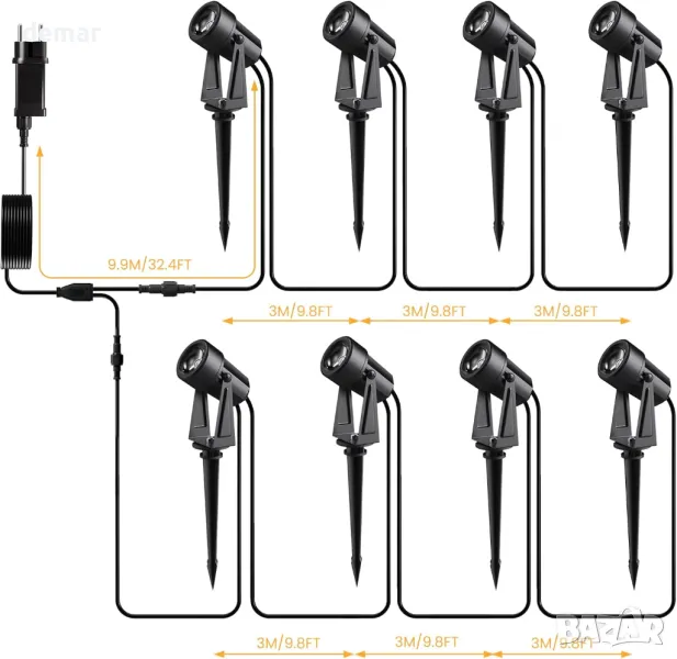 Градински лампи Pogestrand, 28/32 метра, 8 броя, LED пейзажни прожектори, 27V, 3000K, IP65