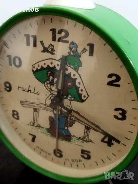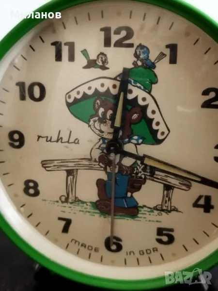 Стар механичен немски будилник Ruhla GDR, работи и звъни.Височина-107 милиметра.Стъклото е пластмасово, има леки наранявания.Номер на часовника500840
