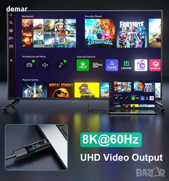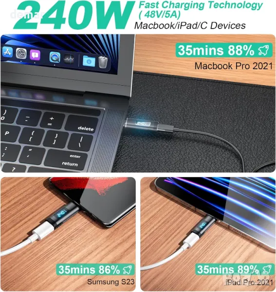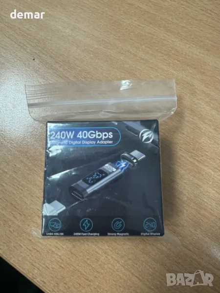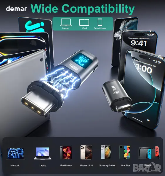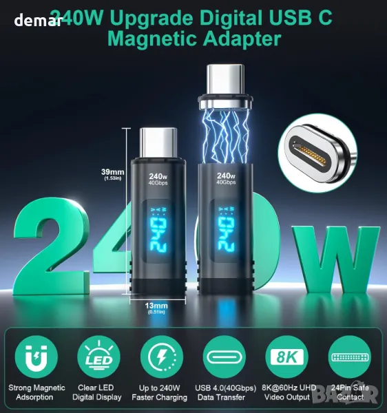 Този магнитен USB-C адаптер поддържа бързо зареждане до 240W, трансфер на данни от 40Gbps и 8K@60Hz видео изход, което го прави идеален за телефони, таблети, лаптопи и монитори. Той разполага с вграден цифров дисплей, показващ напрежение, ток и мощност в реално време, за да следи безопасността и ефективността на зареждането. Съвместим с широка гама от USB-C устройства, включително продукти на Apple, Samsung и Google, той отговаря на стандартите USB 4 и Thunderbolt 4 за максимална производителност. Включва два адаптера и два малки зелени гаечни ключа.