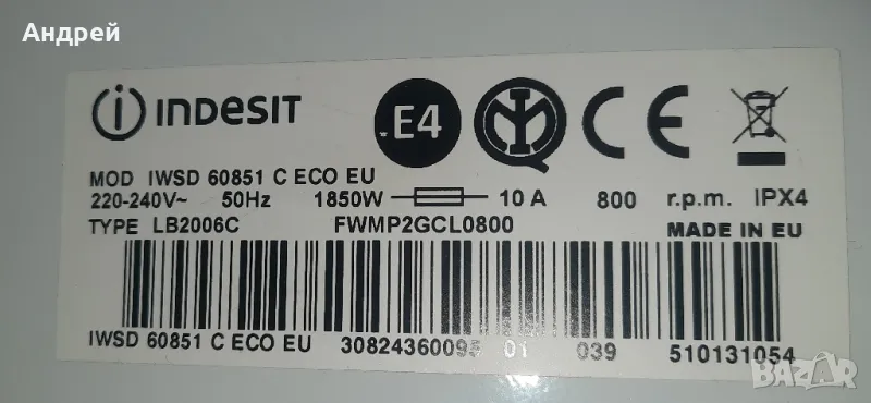 Продавам части за пералня Indesit IWC 60851 C ECO EU. Барабанът е счупен или за лагери.