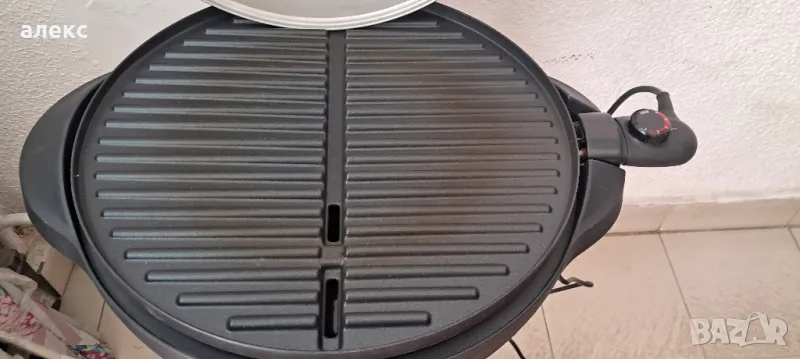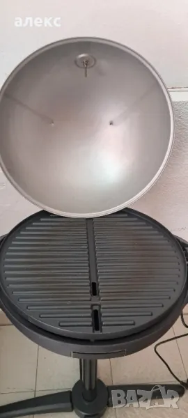 Поставка и настолен грил за вътрешна и външна употреба - Може да се преобразува съответно, външен термометър, много голяма повърхност на скара (диаметър 44,5 см), специално наклонена плоча за скара - За по-добро оттичане на мазнини и масло, извит капак с хладна дръжка