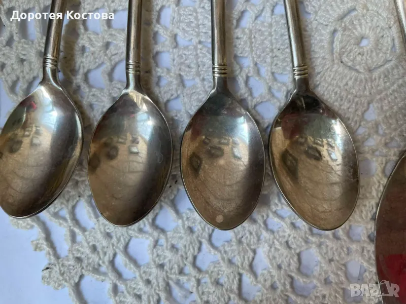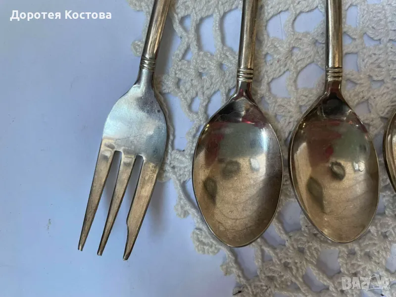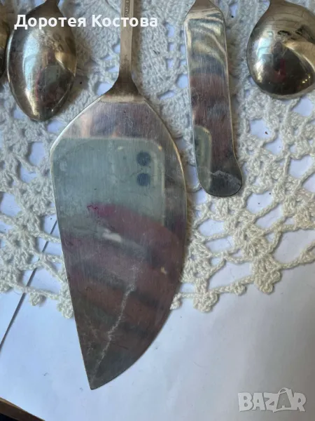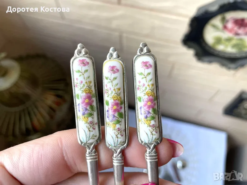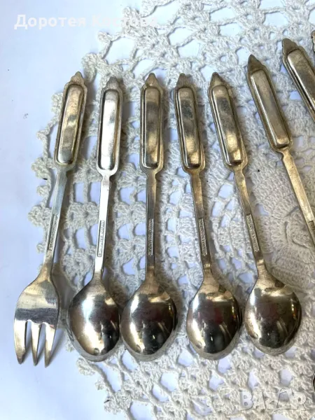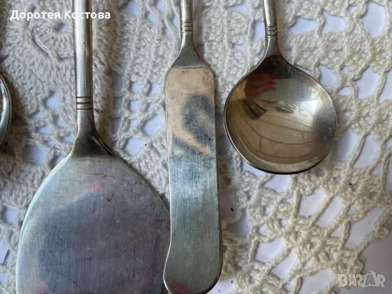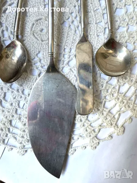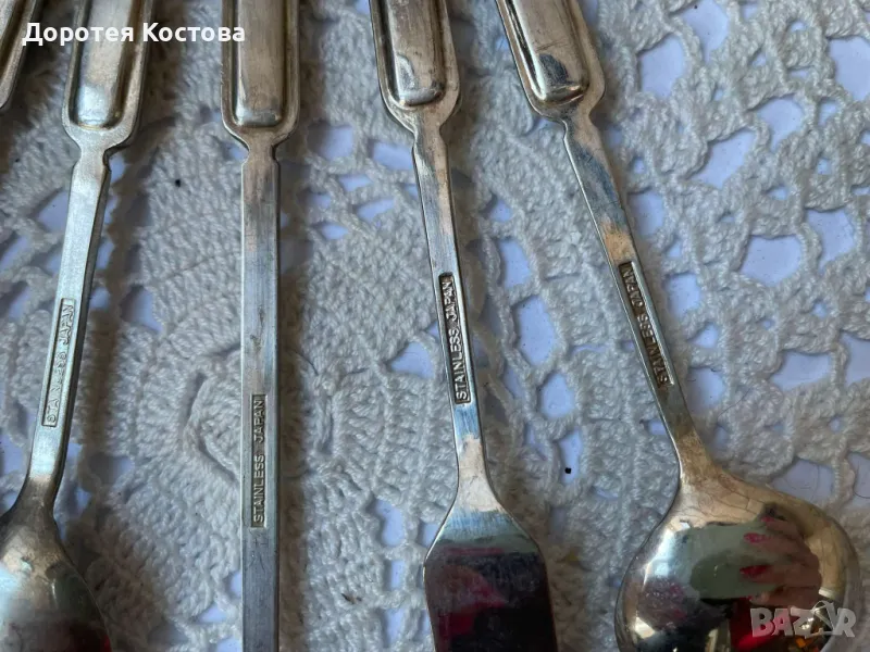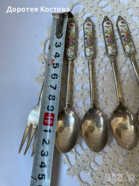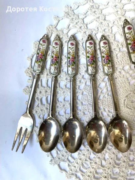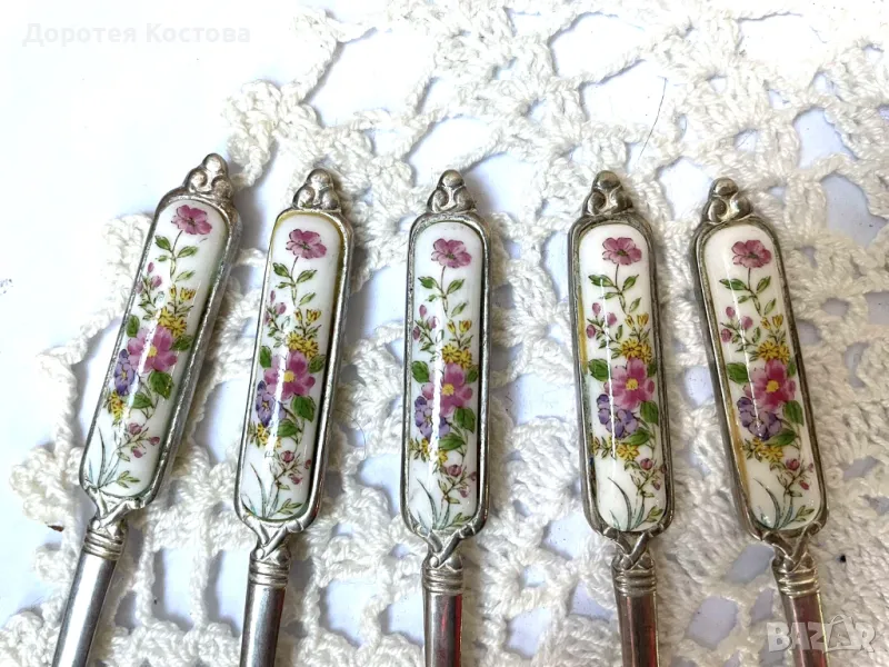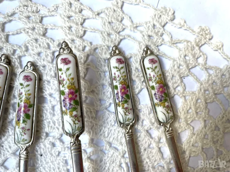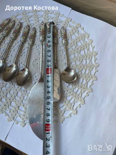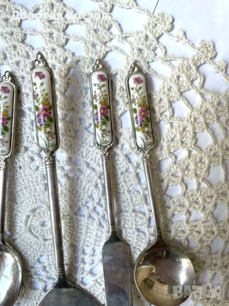 Красиви прибори от Япония с порцеланова плочка на дръжките. Лота включва 4 лъжички + 1 виличка + 1 лопатка + 1 лъжица за сладко + 1 прибор за масло. Размерите са на снимките, всички са с маркировки, не са почистени. Прекрасни, качествени и много нежни. Обща цена - 95 лв.