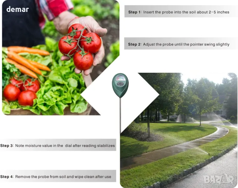 Този измервател на влажност на почвата осигурява бързи и точни показания, като открива влага дълбоко в почвата, отвъд видимото на повърхността. Големият му, лесен за отчитане циферблат показва нивата на влажност в десет скали, като ви уведомява незабавно дали растението ви се нуждае от поливане. Дизайнът с една сонда минимизира нарушаването на корените и избягва издърпването на твърде много почва. Лесен е за употреба - просто го поставете и отчетете - въпреки че не трябва да се оставя в почвата повече от пет минути. Не е подходящ за тестване на твърда почва или течности и сондата трябва да се почиства след всяка употреба.