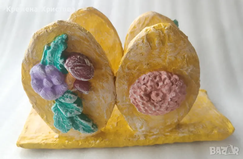 Салфетник с формата на яйчица, ръчно изработен от папиемаше и обемните елементи са направени от глина.Размери: дължина на основата 17см., ширина на основата 7см., дебелина 0,5см.Височина на яйчицата: 9см., ширина 6 см.Цвят: жълт, зелен, светло лилав и червен.Благодаря Ви, че посетихте моята страница!
