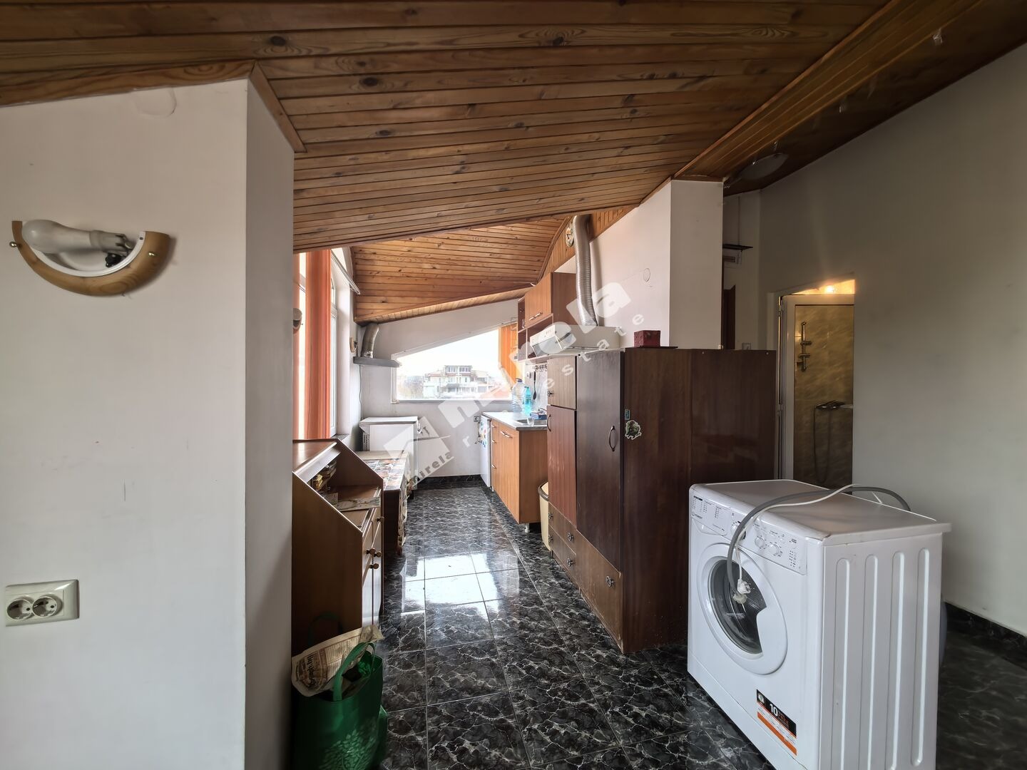 450561 Мирела предлага втори и трети етаж от триетажна масивна къща в района на Окръжна болница със самостоятелен вход. Двата етажа са с по една просторна стая с бокс, сан. възли и баня. На вторият етаж помещението за баня се ползва за склад. Тераси на двата етажа. РЗП на двата етажа 123кв.м.Къщата е добре изолирана. Третият етаж е със статут на ателие. Подходящ имот за нанасяне.