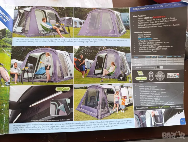 В наличност всички размери форселти чисто нови и слабо употребявани. Анекси и инер тенти за форселти. Тенти. Поли против течение под караваната. Мотомувъри за каравани. Покривала за каравани и кемпери. Килими за форселти. Самонадуваеми къмпинг матраци. Къмпинг столове. Шезлонги. Къмпинг шкафове.Кабели и адаптори за ел.захранване. Заключващи скоби за тегличи и гуми .Водни помпи. Филтри за вътрешни помпи. Контнейнери за чиста и отпадна вода. Къмпинг аксесоари.