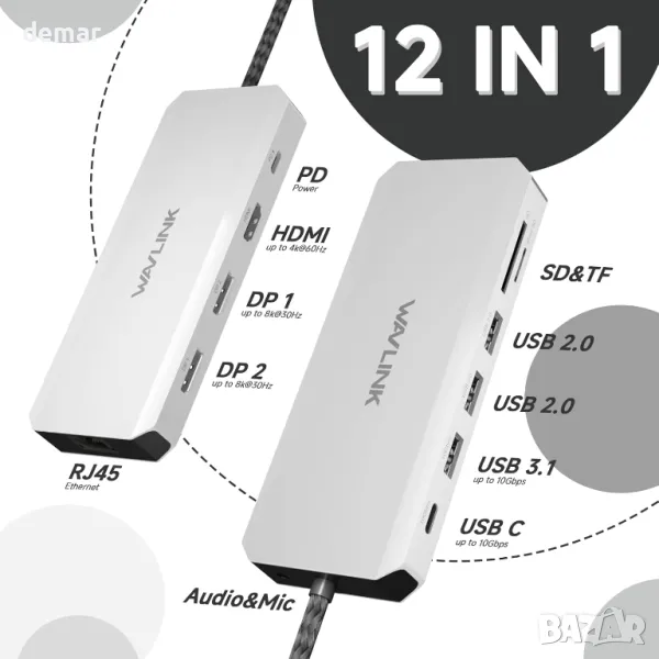 Тази 12-в-1 докинг станция за лаптоп предлага цялостно настолно решение с двоен DisplayPort, HDMI, високоскоростни 10Gbps USB-A и USB-C портове, USB 2.0 за безжични периферни устройства, 100W захранване (85W за зареждане на лаптоп), 2.5Gbps Ethernet, слотове за SD/TF карти и аудио/микрофонна поддръжка. Тя поддържа впечатляващ видео изход, позволявайки един дисплей при 8K@30Hz или 4K@144Hz и два дисплея при 4K@60Hz (само за Windows, изисква DP1.4+DSC1.2). Тя е plug-and-play без нужда от драйвери, но не е съвместима с macOS. Зарядното не е включено и изискванията за захранване трябва да бъдат изпълнени за пълна функционалност.