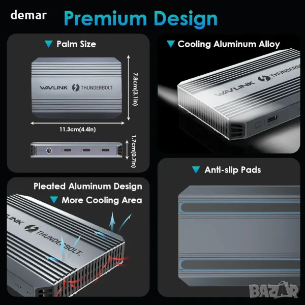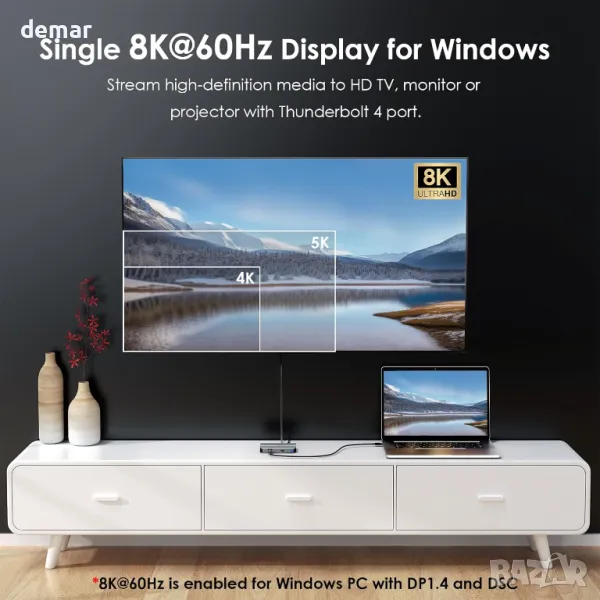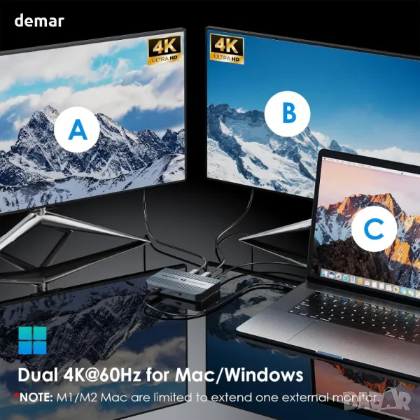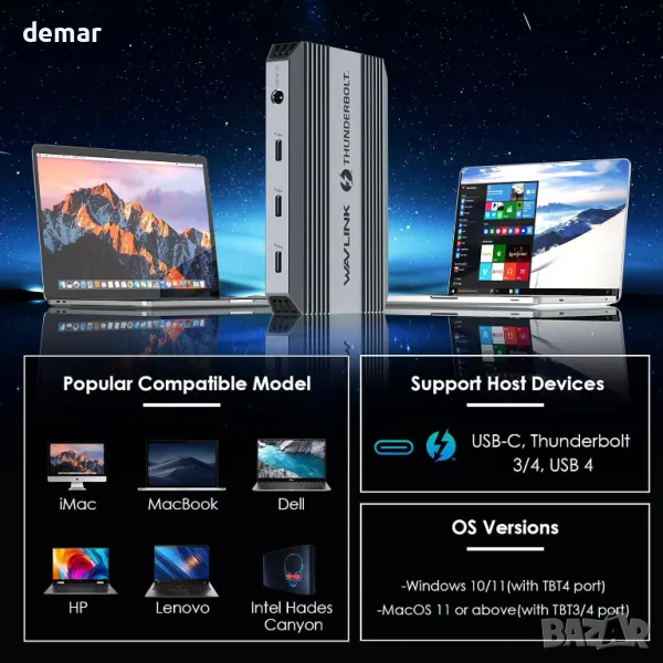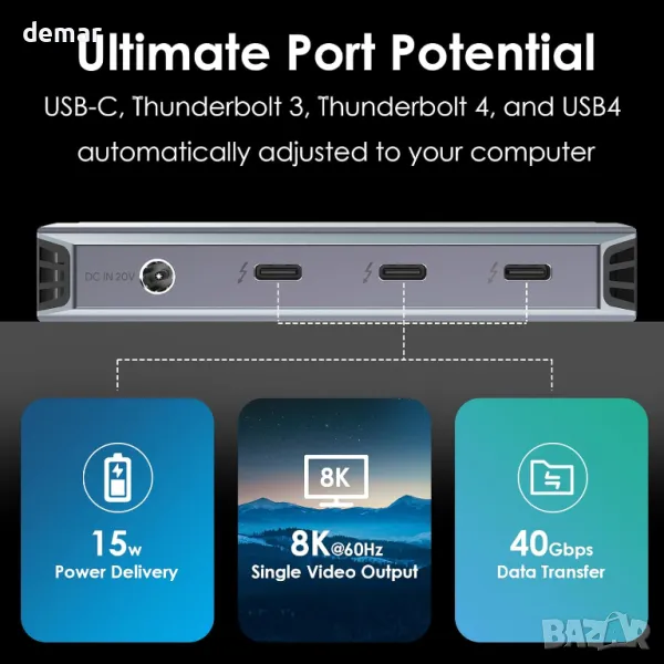 Тази докинг станция Thunderbolt 4 разполага с един upstream host порт с 90W зареждане, три Thunderbolt 4 downstream порта и USB-A 3.2 Gen 2 порт за бърз 10Gbps трансфер на данни. Тя поддържа единичен 8K@60Hz или двоен 4K@60Hz дисплей, идеален за работа или игри с висока резолюция. Захранването до 100W осигурява бързо и надеждно зареждане при използване на взискателни приложения. Съвместима е с Windows 10/11 и macOS 11 или по-нова версия, работи с Thunderbolt 3/4 и USB4 устройства и не изисква драйвери. Забележка: Mac компютрите M1/M2 поддържат само един външен дисплей; моделите M3 се нуждаят от затворен капак за два дисплея.