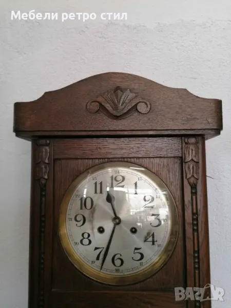 Старинен часовник в отлично състояние. Запазен за годините си, работи отлично, гонг отброяващ всеки кръгъл час и един на полвин час. Минал е профилактика при часовникар. Идеален за ползване, интериор и колекция. Височина - 77см дълбочина - 15см. Цена 360лв.