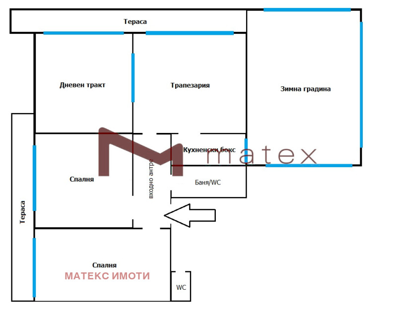 - Апартамент на втория етаж на сградата с площ 103кв.м., представляващ: входно антре, дневен тракт с трапезария и кухненски бокс, две големи спални, баня с тоалетна, тераси пред всички стаи, заедно с голяма зимна градина.