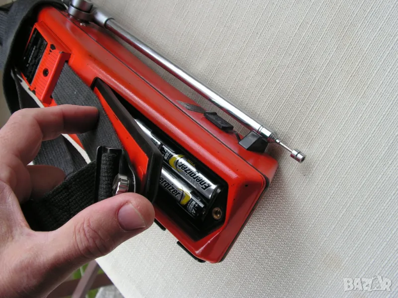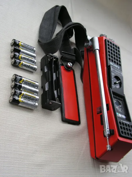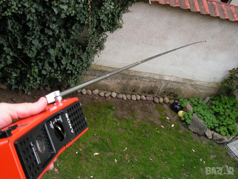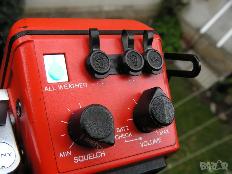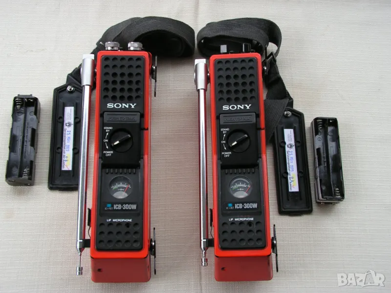 Предлагам две късовълнови / VLF - SW / радиостанции тип „уоки – токи“ на Sony Corporation - Токио, модел ICF-300 W. Устройствата са били собственост на Швейцарската, алпийска,спасителна служба. Произведени са скоро след 1973 година в Япония и са били изключително скъпи. Много са запазени и са в работещо състояние, което може да се провери веднага, защото двете са на една, кварцово стабилизирана честота : 27.085 MHz. Захранват се чрез блокчета поставяни в корпуса, в които се поставят по 8 бр. стандартни батерии R-6 / АА /, или чрез външно захранване 12 V , чрез букса на страничната стена за захранване от кола или друг източник. Станциите имат дълги телескопични антени /съответстващи на честотата на която работят/- някъде около 140 см., които се виксират с палец под различен ъгъл. Тялото с вградени микрофон и говорител е с габарити: 18 / 8 / 9 см. Има постоянен ремък за носене през рамо или на гръб и по две скоби с ширина 5 см за прикачане към оборудване. Радиостанцията има вградена стрелкова система, която показва силата на сигнала, както и състоянието на захранването. Радиостанциите могат да работят и с външен микрофон и срушалки. Херметизирани са по стандарта за 80-те години „ Всякакви условия“ , като са в сигнално оранжево. Уоки-токитата могат да се нарекат и „винтидж“, защото имат страница в Radiomuzeum.
