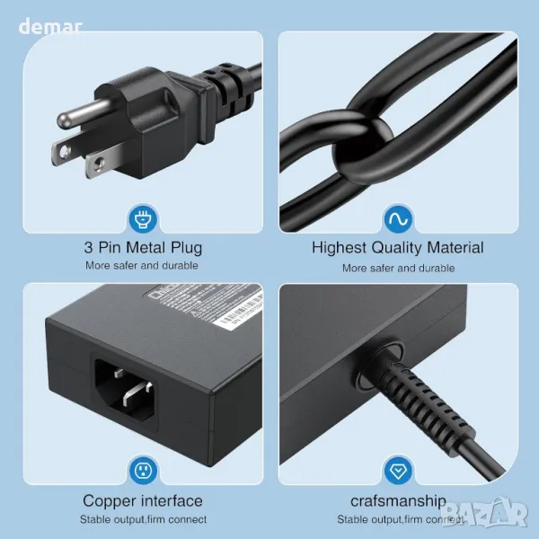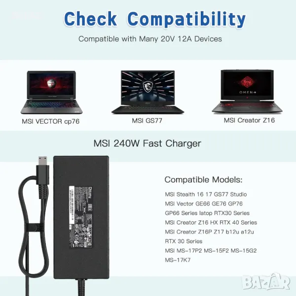 Спецификации: Вход: AC 100-240V, 50/60Hz, Изходно напрежение: 12A / 20V 240W. Специални характеристики: Защита от късо съединение, ниска консумация на енергия, пестене на енергия, защита от претоварване, защита от прегряване. Подходящ за MSI Creator Stealth 16 17 17Studio GS77 Vector GP77 Sword 15 Katana 15 17, 12A A20-240P2A захранване за лаптоп. Подходящ за MSI Creator Pro Z16P Z17 16 Vector GP66 GE66 Creator Z16 Z17 16. Един адаптер за много модели лаптопи MSI. А теглото е толкова леко, че адаптерът се побира лесно в чанти, портмонета и дори джобове, докато пътувате навсякъде.