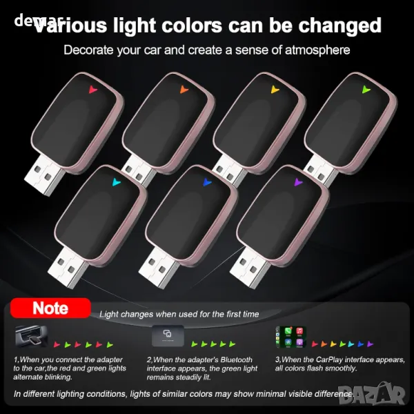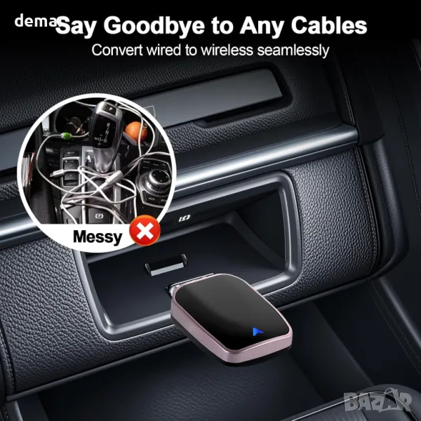 Този компактен безжичен CarPlay адаптер ви позволява да надстроите съществуващата кабелна CarPlay система на вашия автомобил за iPhone с iOS 12 или по-нова версия. Той е plug-and-play - просто го свържете към USB порта на вашия автомобил, сдвоете го чрез Bluetooth и сте готови. Не са необходими допълнителни приложения или драйвери. След като бъде сдвоен, той се свързва автоматично отново, когато стартирате двигателя. Поддържа пълните функции на CarPlay, като навигация, музика и разговори, а малкият му USB дизайн спестява място и добавя визуален щрих с променливи цветове на светлината. Включва USB към USB-C адаптер и удължителен кабел за гъвкави опции за свързване.