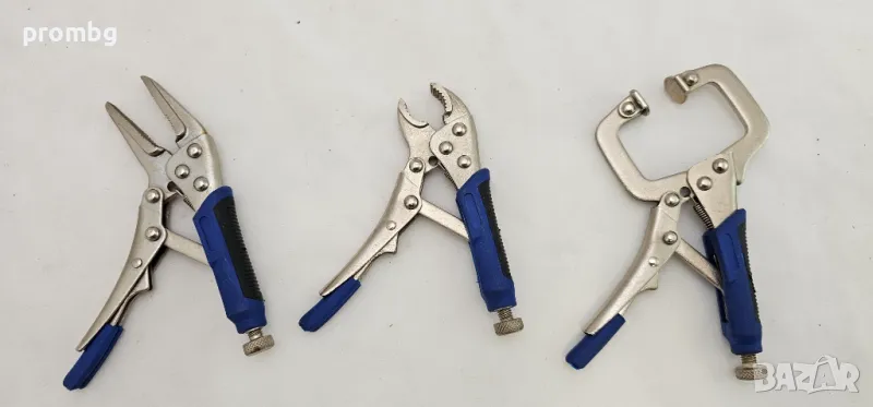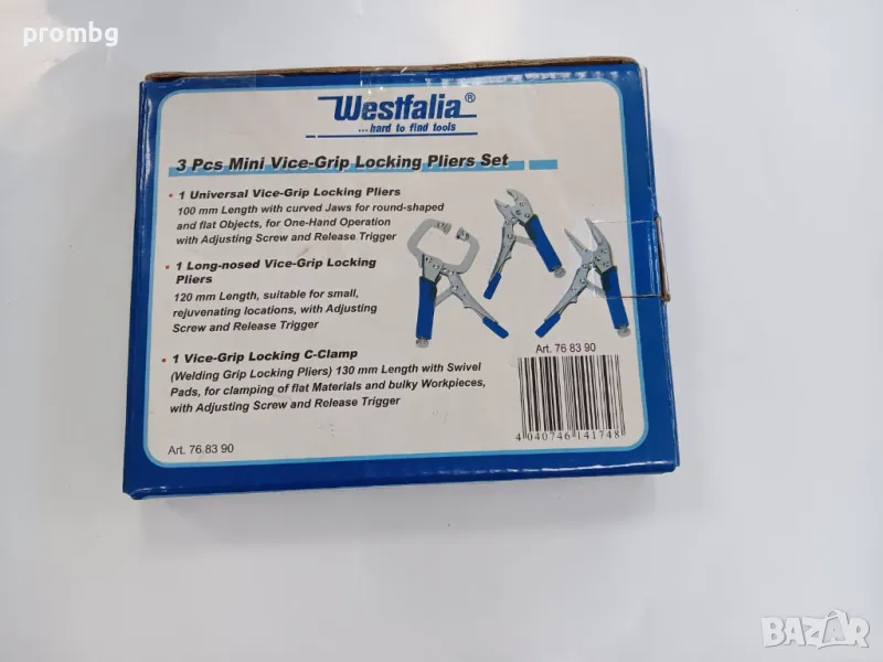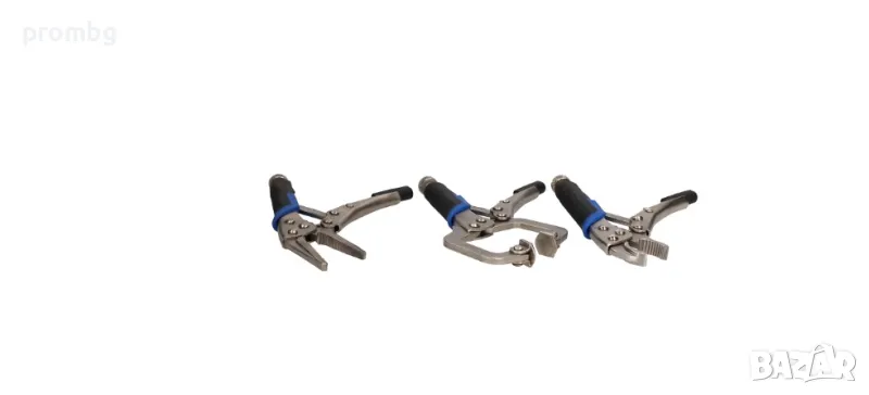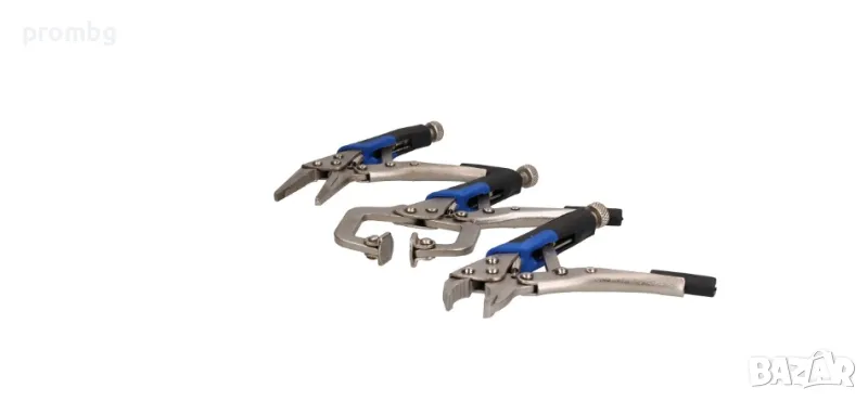 мини заключващи клещи, чираци 3бр., Westfalia- Германия. Материал: хром-ванадиева стомана с термично обработени назъбени челюсти. Имат функция за бързо освобождаване, назъбени челюсти за максимален захват и регулиране на винта с дръжка за бързо освобождаване. Защитено освобождаване позволява бързо освобождаване, но предпазва от случайно освобождаване. Остава регулирано за повтаряща се употреба Заключващият дизайн ги прави полезни за задържане на малки предмети, панели и др. Клещите са с гумени дръжки за удобство и захващане.