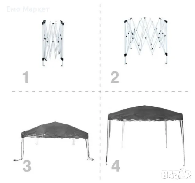Марка: Muhler;Модел: Сгъваема шатра 300х300xH260 cm;Размери: Дължина: 300 см/Ширина: 300 см/Височина: 260 см;Цвят: Сив;Материал – покрив: Полиестер 180 g/m²;Материал – странични стени: Полиестер 140 g/m²;Стоманени тръби 40x40x0.7 мм (основна рамка);Стоманени тръби 18x18x0.6 мм (вътрешна структура);Тип конструкция: Сгъваема (pop-up механизъм);Устойчивост: Вятър, слънце, лек дъжд;Лесен монтаж/демонтаж: Без нужда от инструменти;Приложение: Градина, двор, изложения, пазарни щандове, къмпинг, събития;