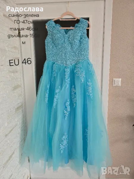 Като цвят роклята е синьо-зелена