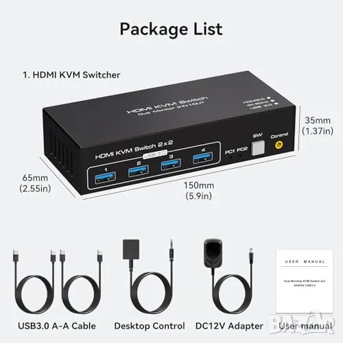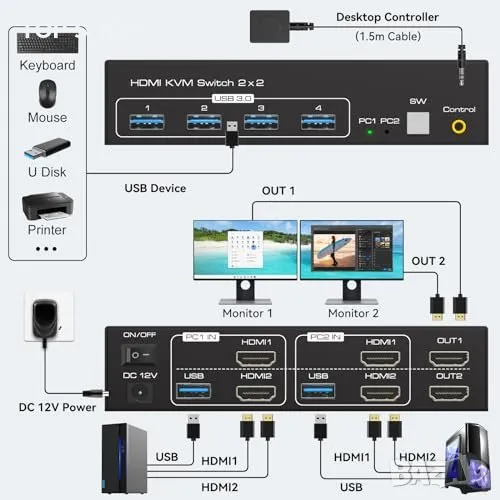 Двоен монитор КВМ ключ: Управлявайте до 2 компютъра с една клавиатура, мишка и 2 монитора. Ефективно решение за намаляване на бюрократичния хаос.