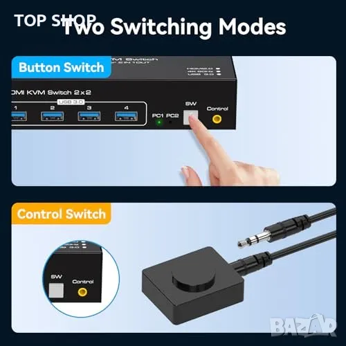 2 режима на превключване: Поддържа превключване чрез бутон на панела и външен контролер. Изисква 2 HDMI изхода на компютъра.