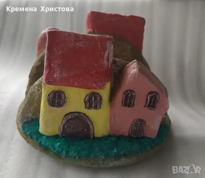 Салфетник с декорация от къщички от двете страни, ръчно изработен от папиемаше и глина.