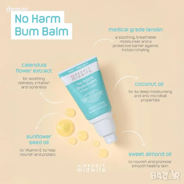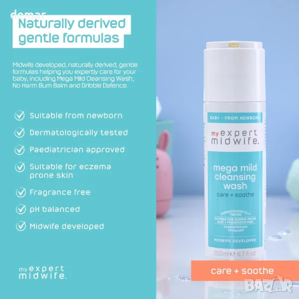 Това нежно трио за грижа за бебешката кожа, разработено от акушерки, включва нежно почистващо измиване с невен, ружа и овесени ядки за мека и чиста кожа още от първото къпане; дишащ балсам против образуване на секрети с ланолин, невен и подхранващи масла за предпазване от обриви; и крем за пелени само с пет натурални съставки, включително медицински ланолин и невен, за успокояване и защита на деликатната кожа. Всички продукти са одобрени от педиатри, подходящи за чувствителна кожа и леко ароматизирани с етерични масла.
