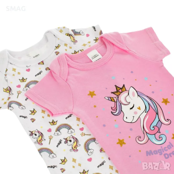 Бебешко боди от памук с къс ръкав, розово с дизайн на еднорог, златисти звезди и послание "Magical Dreams" и бяло с еднорози, цветни дъги с послание "Magic" и отвор в долната част.