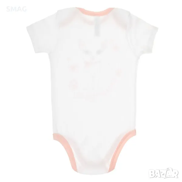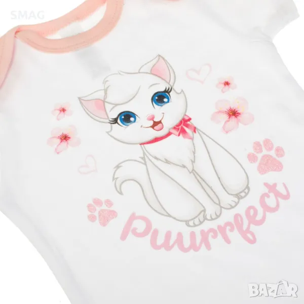Памучно боди с къс ръкав, бяло с розови детайли, котешки дизайн и отвор в долната част.