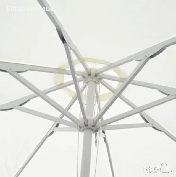 Диаметър на сенника: 250 см;Цвят: Бял;Материал на сенника: Полиестер с UV защита;Материал на конструкцията: Метална тръба – прахово боядисана за устойчивост на корозия;Сгъване: Да, лесен за прибиране и пренасяне;Устойчивост на атмосферни влияния: Подходящ за използване при нормални летни условия;Препоръка за употреба: Да се прибира при силен вятър или буря, за да се удължи животът му;