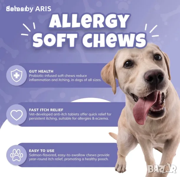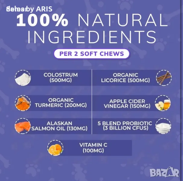 Продуктът за кучета с пробиотици "Itch-Relief Soft Chews" е обогатен с пробиотици, ключов компонент за здравето на червата на кучето, който може да помогне за намаляване на възпалението и сърбежа. Разработени от ветеринари, тези таблетки против сърбеж осигуряват бързо и ефективно облекчение от постоянния сърбеж. Изработени от внимателно подбрани, натурални съставки във вкусни дъвки с вкус на сьомга, предназначени да осигурят облекчение през цялата година за вашия сърбящ четириног приятел. Холистична смес с органични куркума, сьомгово масло, корен от сладник, витамин С, ябълков оцет и пробиотици насърчава здравословната козина, успокоява кожата, подсилва имунитета, балансира pH и поддържа здравето на червата, гарантирайки благополучието на вашия домашен любимец. Дайте предимство на здравето на вашето куче с тези 100% натурални, без зърно, без ГМО лакомства със сертификат за качество GMP, насърчаващи неговото здраве по естествен начин. Бъдете свидетели на по-щастливо и здраво куче в рамките на 30 дни.