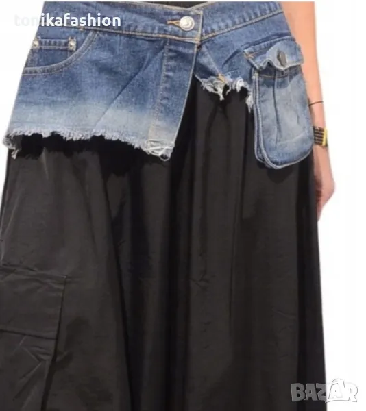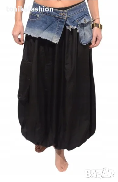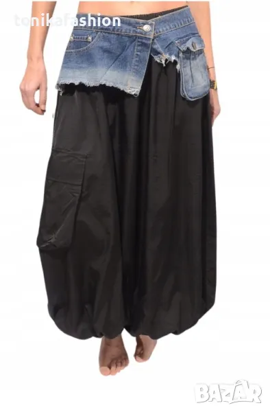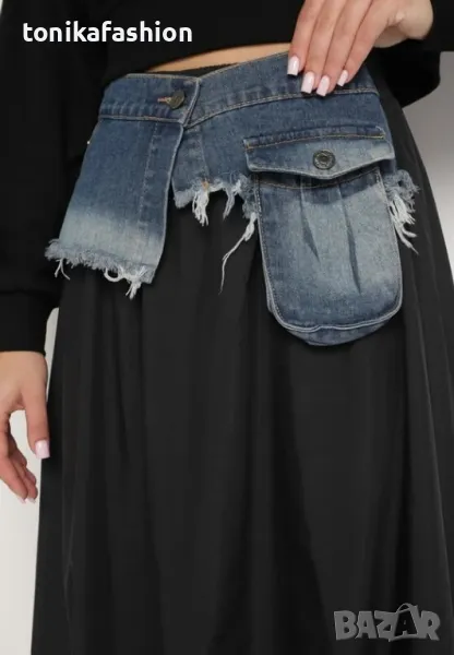 Модела е с ластик на талията и дънкова платка с джоб на предната част.Страничен голям джоб с капак.